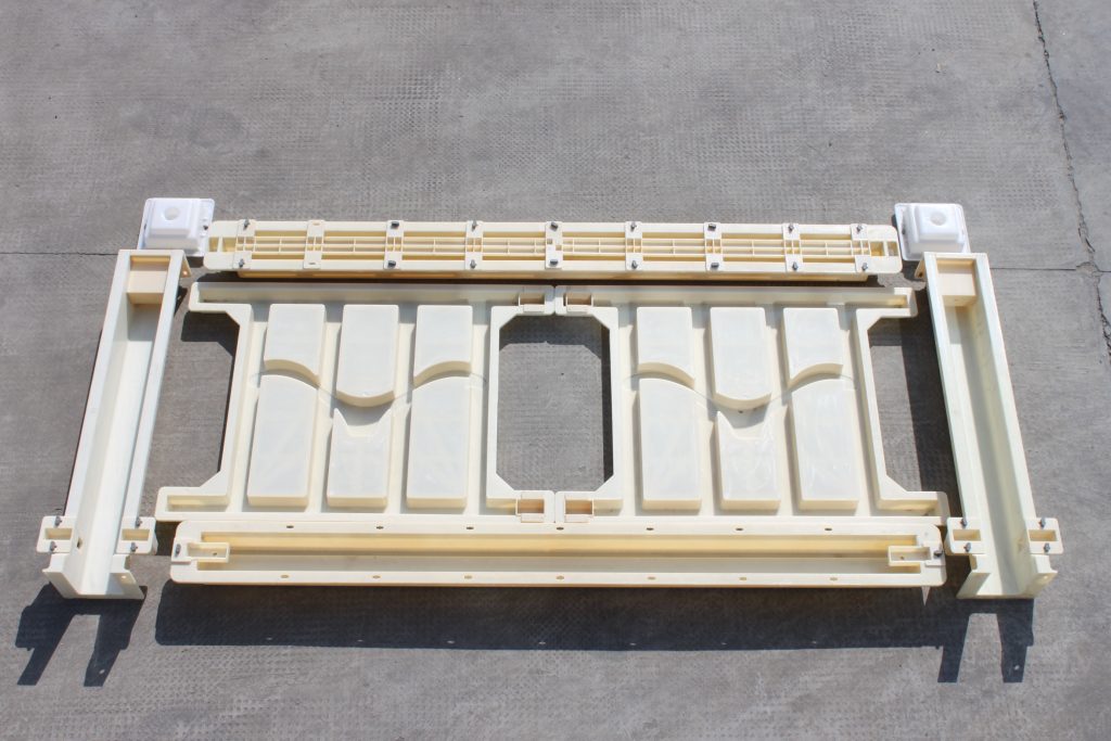 三,72型高鐵護(hù)欄欄片模具,之所以整套護(hù)欄模具稱為海鷗高鐵護(hù)欄塑料模具,原因就是護(hù)欄欄片模具采用了海鷗設(shè)計(jì),分為AB兩面,尺寸均為101*72*5厘米,拼接處分別置入欄片堵頭,方面施工。