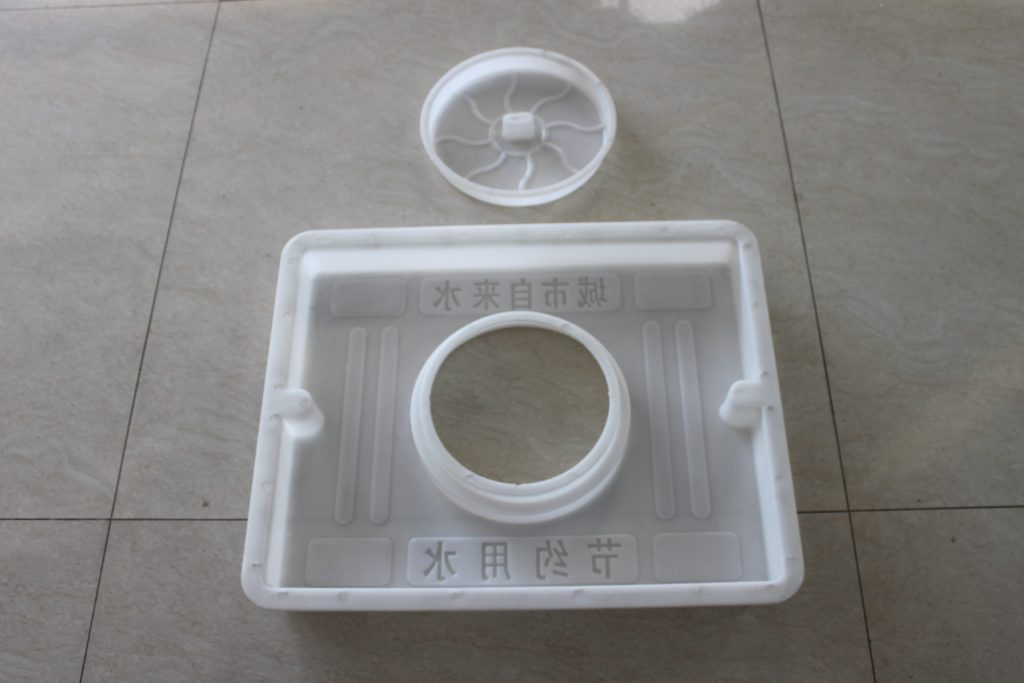 此水泥方井蓋模具采用聚丙烯樹(shù)脂經(jīng)注塑加工而成,模具兩端以小開(kāi)口設(shè)計(jì),以方便后期檢查時(shí)的位置移動(dòng)。在方井蓋模具的表面加以防滑條及供水部門專屬字樣,即“節(jié)約用水”和“城市自來(lái)水”標(biāo)志。而在方井蓋模具的中間設(shè)立一個(gè)小型的圓孔蓋座,為日后水廠對(duì)于自來(lái)水管的檢查工作帶來(lái)更大便利。