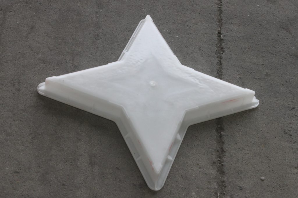 從表面上看,四角星圖案由里到外整體設計,不論在外形還是內在裝飾圖案上,均是如此。細節(jié)之處在于在塑料彩磚模盒內部以光面和毛面的四角星型圖案組成,在實際預制完水泥彩磚后,起到美觀及防滑效果,深受施工方青睞。