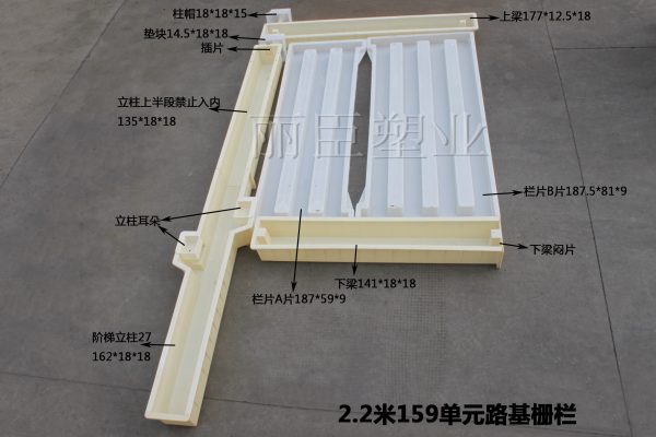 2.鐵路防護柵欄模具上下梁,均采用ABS材質(zhì),上梁尺寸為177*12.5*18CM,下梁尺寸為141*18*18CM,及配備下梁悶片。