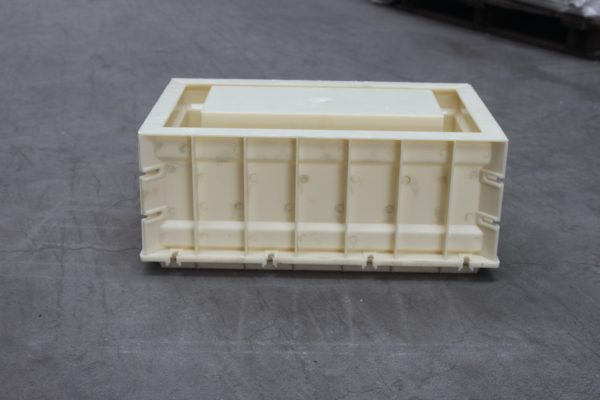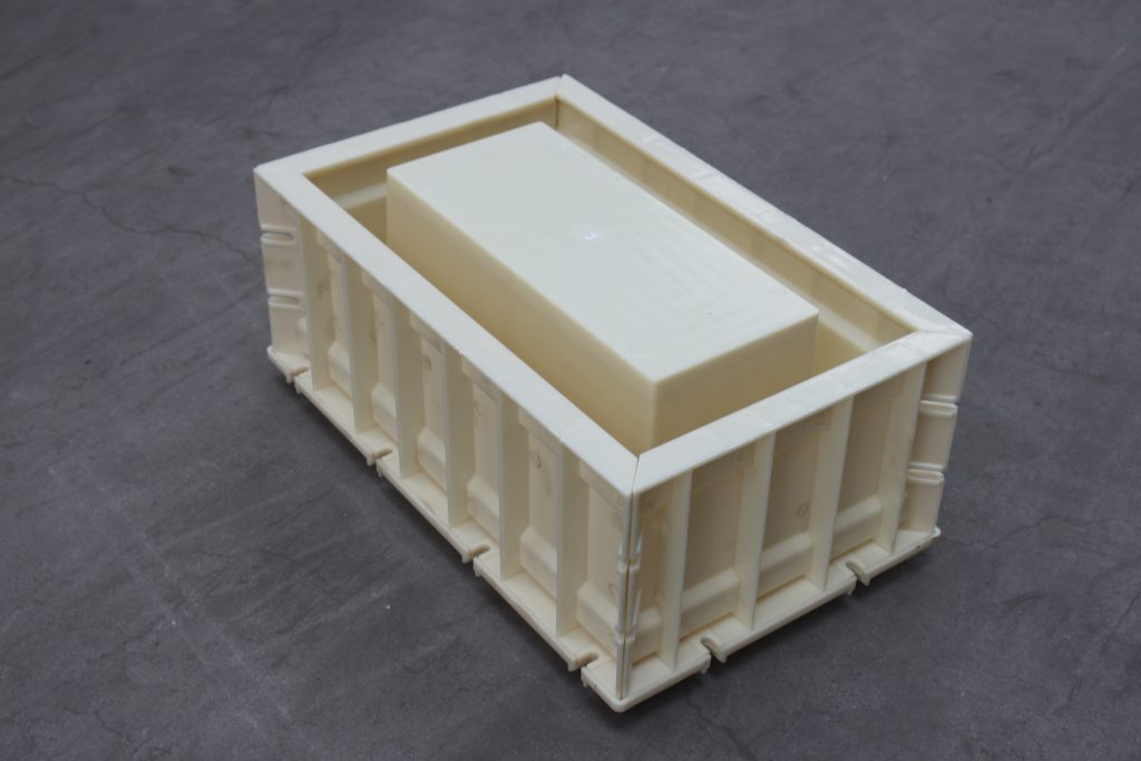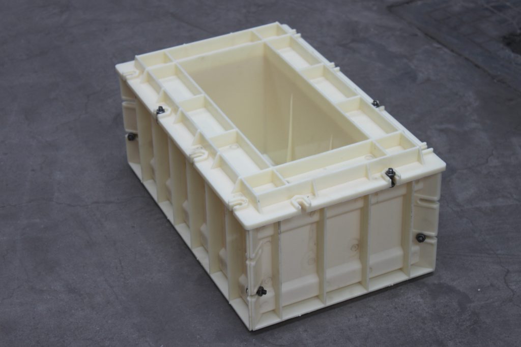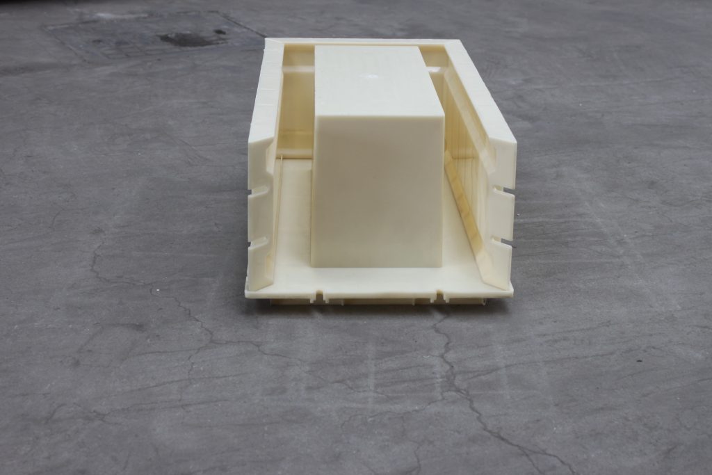 ABS材質(zhì)的空心磚塑料模具,整體呈長方形樣式,總共分為三個部分,空心磚塑料模具底座、側(cè)面短板及側(cè)面長板,在長板與短板鏈接處均采用橢圓凹槽,用于鐵質(zhì)螺絲螺帽拆卸裝配。鑒于塑料模具自身尺寸較大,為了使得空心磚塑料模具施工更為耐用牢固,在每一個配件背部分別采用十字加強(qiáng)筋設(shè)計,以確保正常施工。