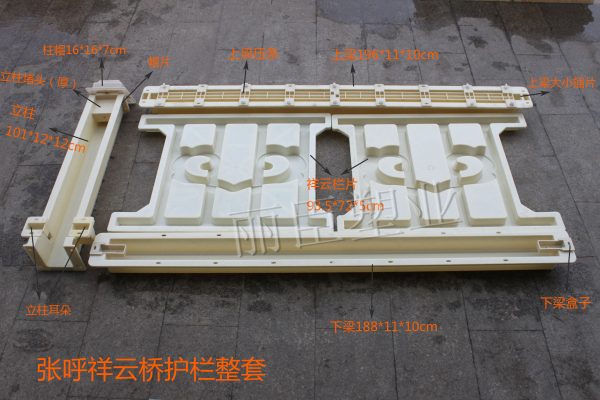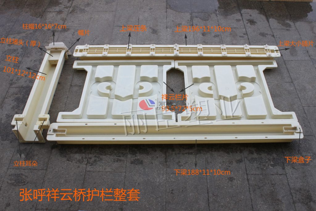此混凝土護(hù)欄模具主要用以張呼鐵路(張家口南站-呼和浩特東站)所需水泥混凝土護(hù)欄預(yù)制建設(shè),其中所有原料都采用高精度標(biāo)準(zhǔn)的ABS塑料經(jīng)高溫注塑加工成型,水泥欄片主要以祥云雕刻設(shè)計(jì)。