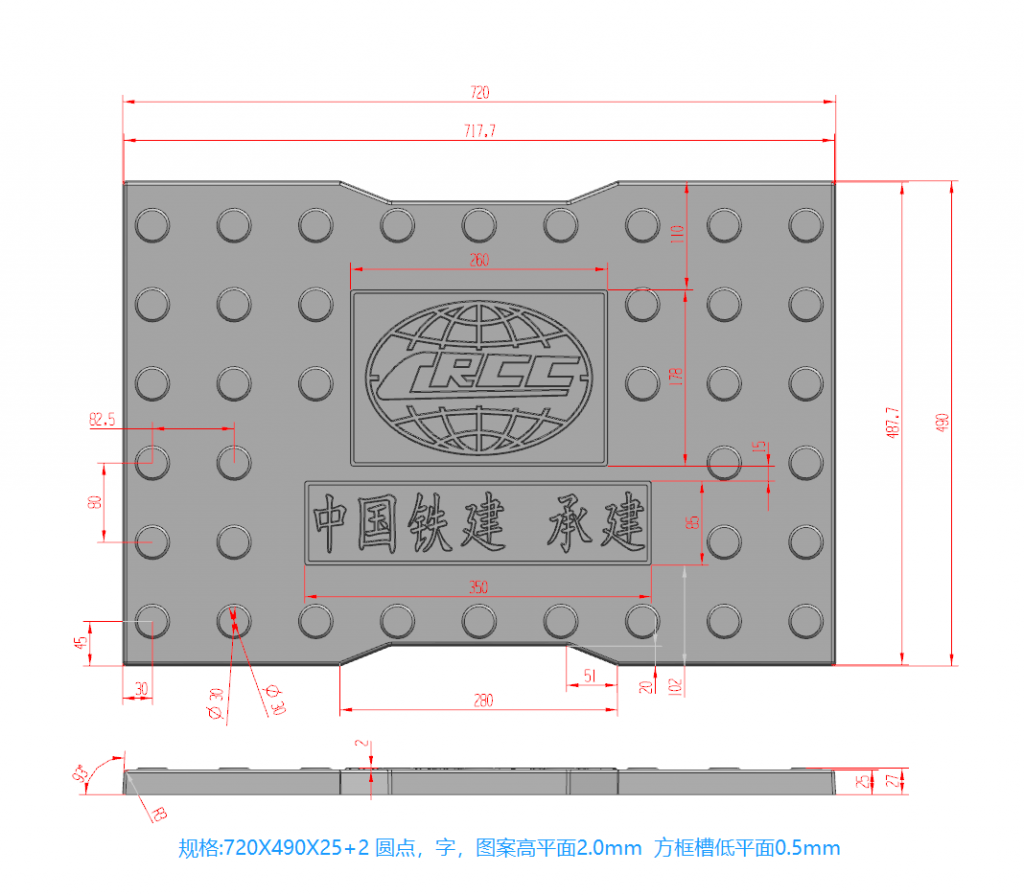 模具較薄,主要用于rpc材質(zhì)預(yù)制制作,花紋為缺口圓點,中間帶有中鐵圖標(biāo),底部設(shè)有中國鐵建 承建字樣,為中鐵專用模具。