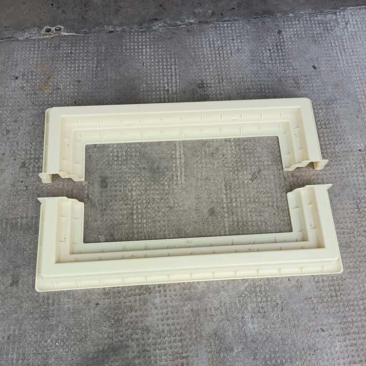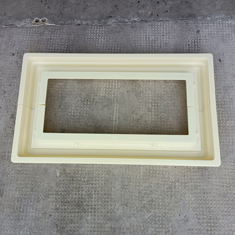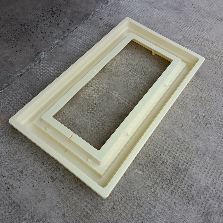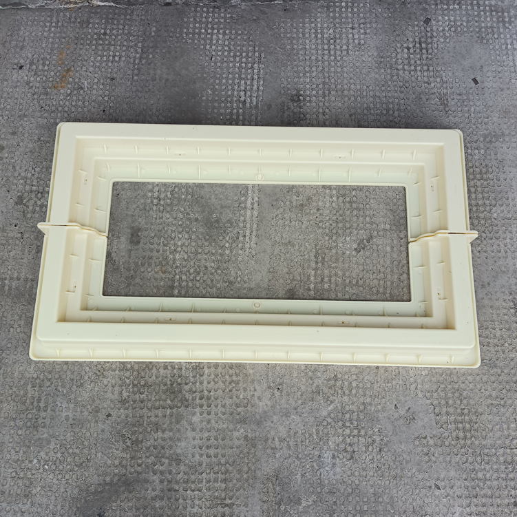 方井座塑料模具,模具采用拼接方式、為兩個組裝而成、寬度可以增加調(diào)節(jié),有設(shè)配件井座B,該長度、寬度尺寸為模具尺寸最外邊、包括翻邊。
