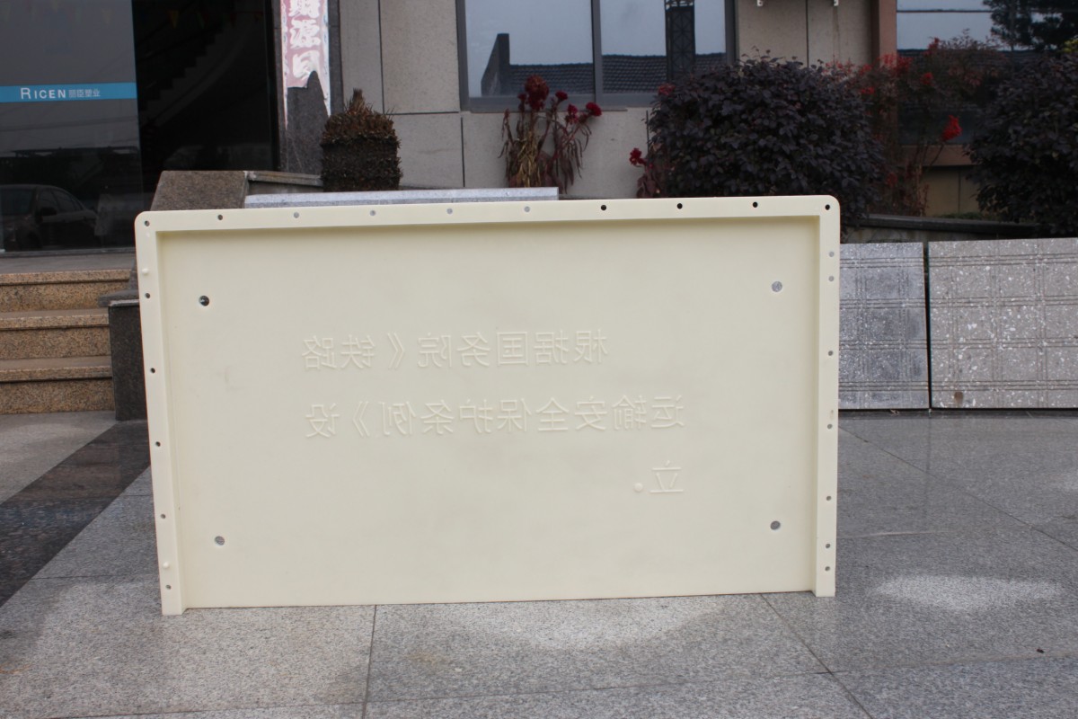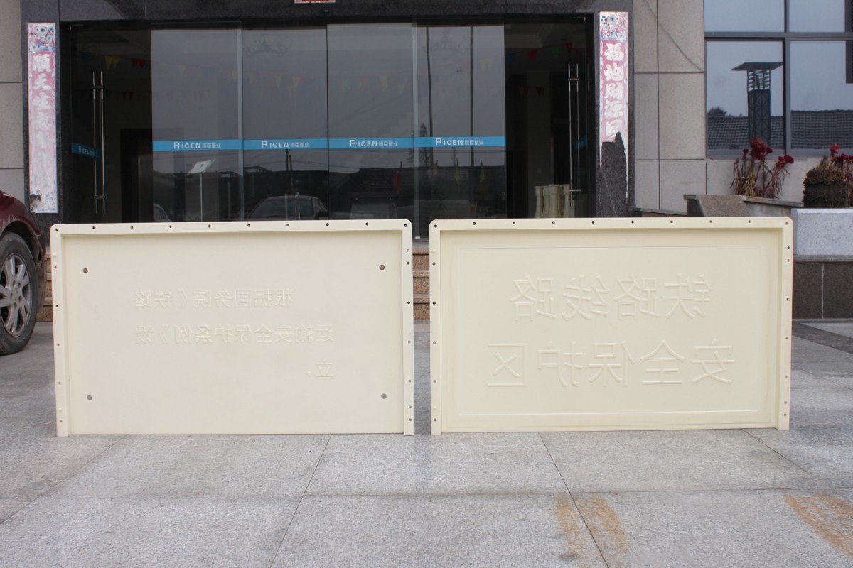 標(biāo)識(shí)牌塑料模具主要的結(jié)構(gòu)為2快拼合而成。標(biāo)識(shí)牌總共分為2個(gè)部分:一面印有“國家鐵路安全線路保護(hù)區(qū)”字樣,另一面為“根據(jù)國務(wù)院《鐵路安全運(yùn)輸保護(hù)條例》設(shè)立”字樣。此水泥警示牌模具為國家中鐵局定制,任何企業(yè)及個(gè)人制造都需國家鐵路局授權(quán)許可才可制造生產(chǎn)。