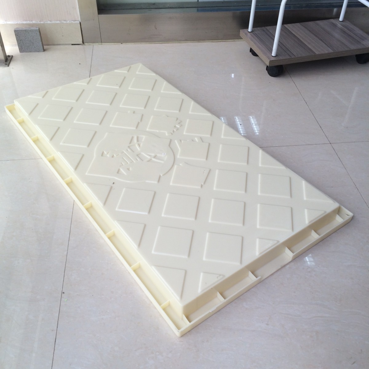 ABS材質(zhì)的菱形圖案水泥預制蓋板模具,使用注塑工藝一體成型。此預制蓋板塑料模具主要設(shè)計為加印“中鐵五局”字樣和“中鐵五局LOGO”圖案,定制可修改圖案應用于其他工程局的應用。